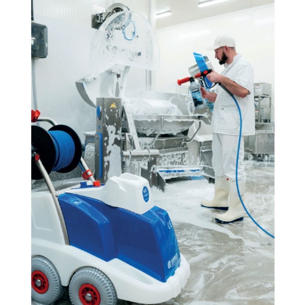 To urządzenie łączy wytrzymałość, mobilność i ergonomię. Stabilna konstrukcja Rotomold, trwałe komponenty oraz zaawansowane funkcje bezpieczeństwa sprawiają, że myjka jest niezawodnym narzędziem codziennej pracy w wymagających warunkach przemysłowych. Ergonomiczne rozwiązania, takie jak system Start-Stop, szybkozłącza i łatwe dozowanie chemii, znacznie ułatwiają pracę operatora, a duża mobilność pozwala sprawnie przemieszczać urządzenie nawet w trudnych przestrzeniach.